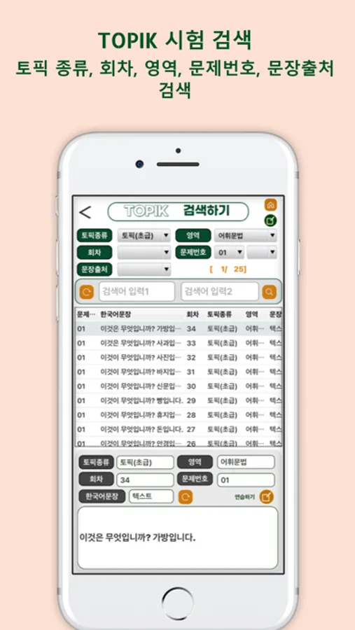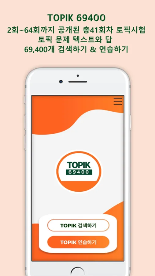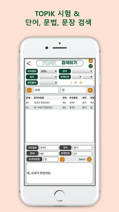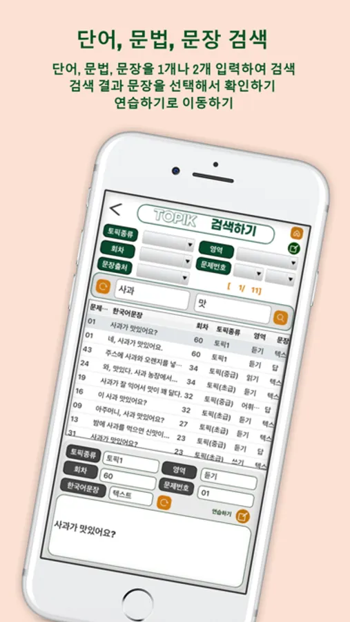 - 2회부터 64회까지 공개된 총41회차 TOPIK 시험의 문제 텍스트와 답 69,400개를 검색하고 연습할 수 있다.