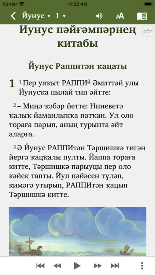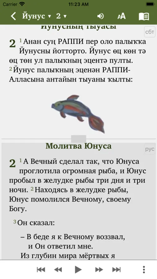 The app contains audio for the book of Jonah (Йунус).