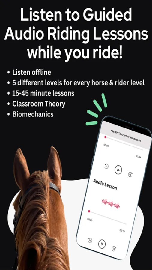 Spice up your rides, build unique training plans for you and your horse and get step-by-step instruction while you ride. These listen and ride horse riding lessons are based on rider biomechanics and include a variety of disciplines such as jumping, dressage, endurance, western and mounted games exercises. You'll also discover theory lessons and challenges inside the app to help you structure your rides and know the WHY's behind what you learn.