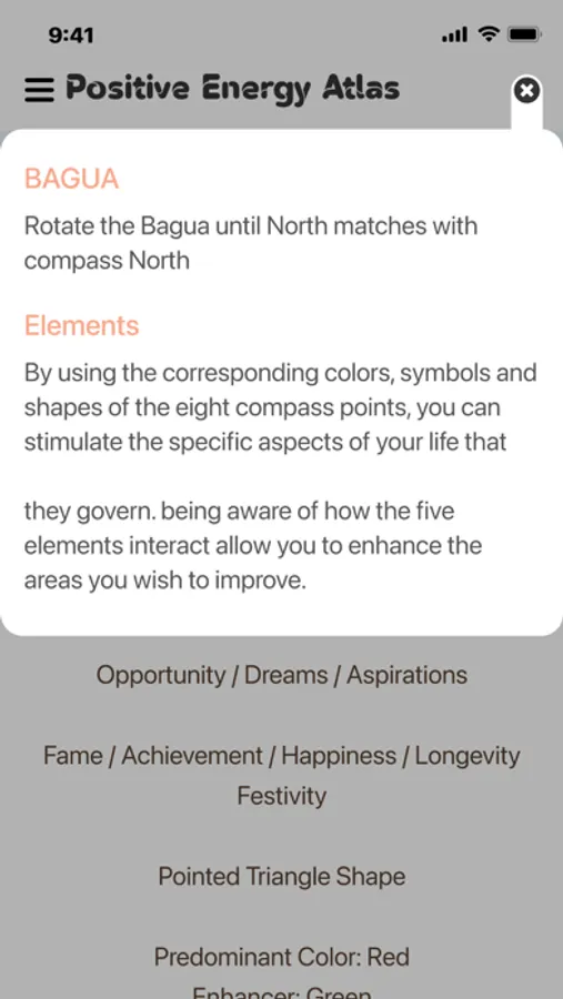 Whether you have health issues, relationship problems, or need a career boost? Use Positive Living App and instantly find the matching element that needs to be placed and in which direction to improve your current life condition.