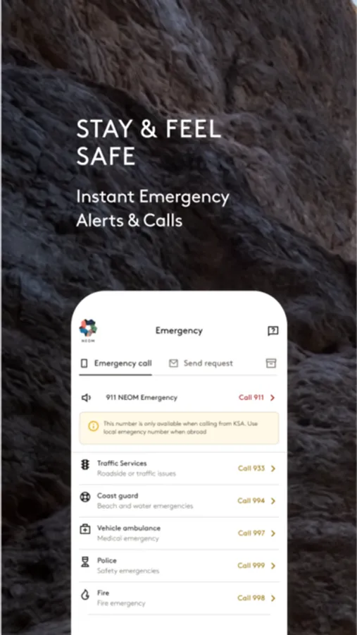Emergency: Your safety is paramount. With our integrated emergency call function, you're always a tap away from assistance, ensuring peace of mind wherever you are in NEOM.