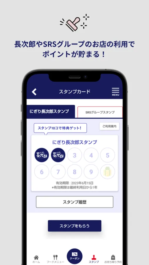 長次郎のお店やSRSグループ(和食さとなど)でスタンプを受け取れます。