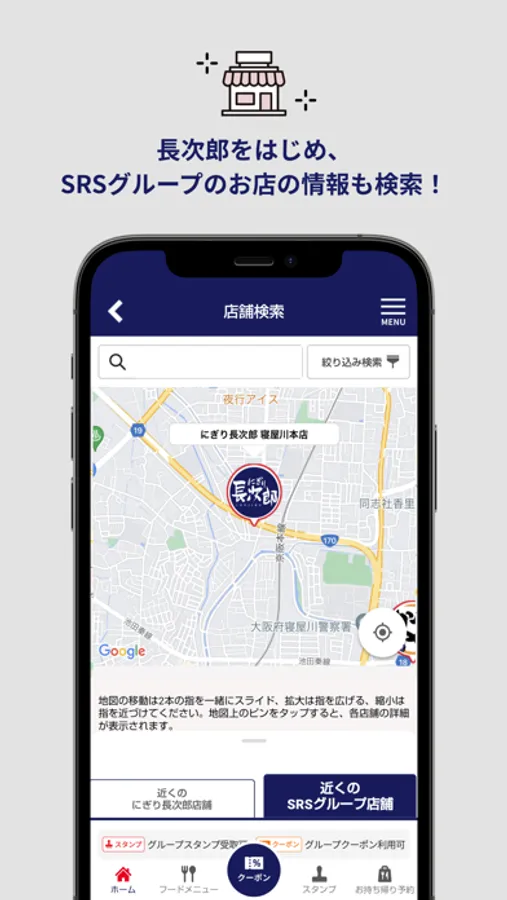 お近くの店舗や、特定の条件に合った店舗の検索が可能です。