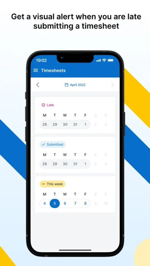 * Keep track of the status of your timesheet, get a visual alert when you are late submitting them