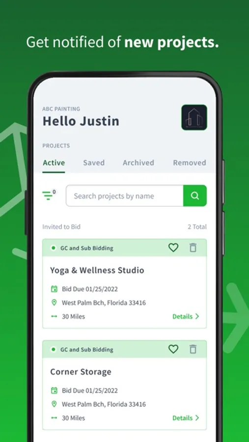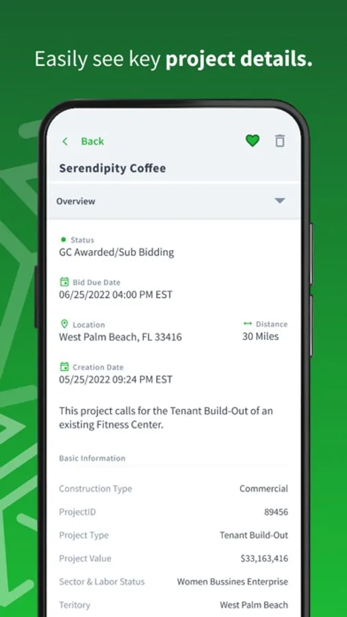 Narrow your search by what matters most and quickly see key project details including which GCs are bidding on it.