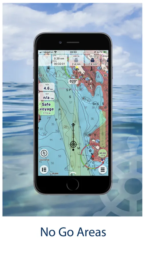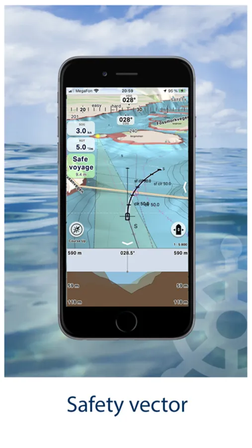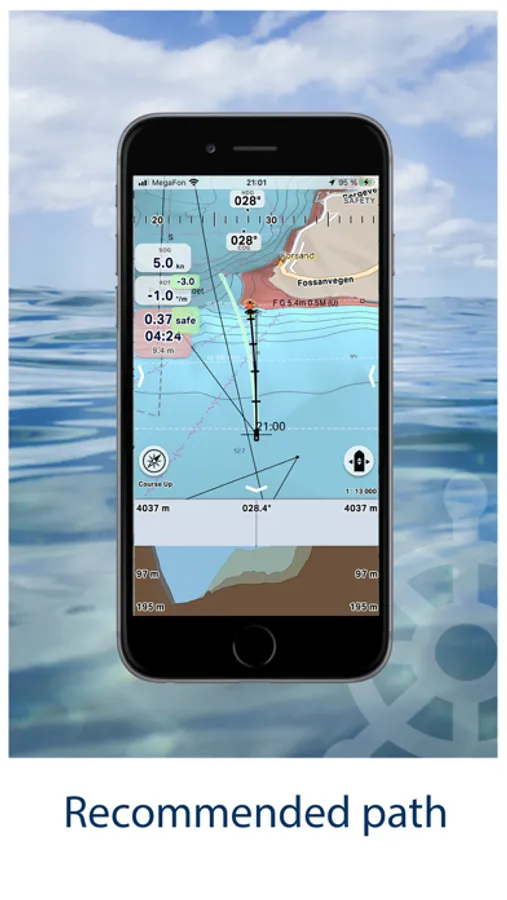 Swipe from below and from side to side. Profiles of seabed relief, safety path simulator, docking.
