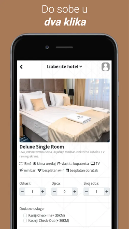 Nije neophodno kreirati račun da biste koiristili aplikaciju, te je to prednost za korisnike koji žele samo da se informišu i pogledaju šta nude hoteli, da pregledaju fotografije i same cijene korištenja usluga.