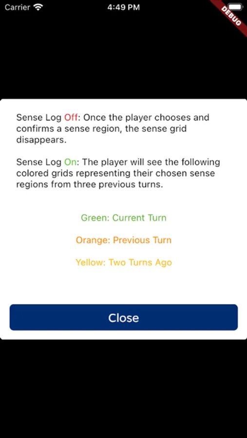 Prior to making each move, a player selects a 3×3 region of the chess board (via green outline on the relevant squares) to “sense” the pieces in that region. The player is informed of the true piece configuration within the sensed 3×3 region. The opponent is not informed about where the player sensed.