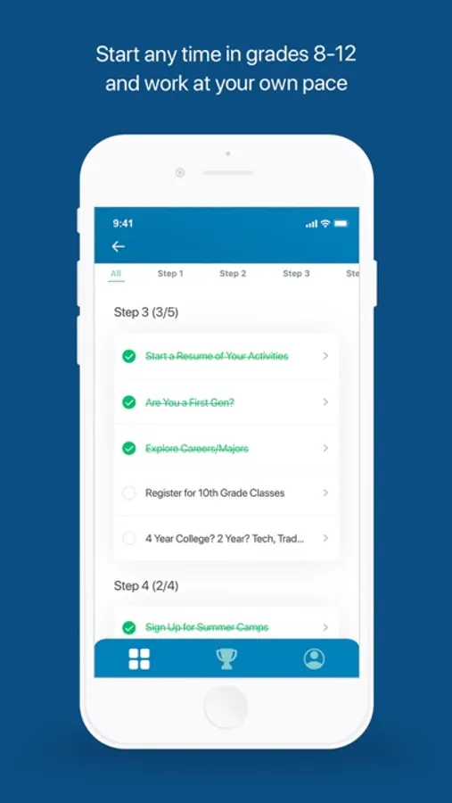 Progress: See your progress percent at all times, in grades 8-12, as you prepare for, select, and apply to colleges