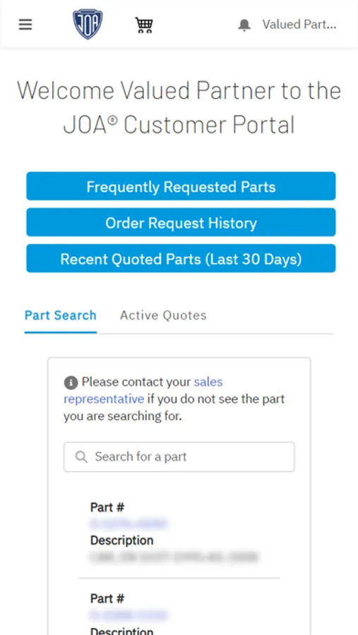 The JOA Portal app provides secure, mobile access to your JOA spare parts on-the-go. As a customer, portal allows you to: -Search spare parts, create self-service spare parts quotes, and submit purchase orders. Immediately take action right from the app. -Get communications and updates for spare parts status tracking, pricing updates, and leave feedback. -Browse your quotes and orders history. - Stay connected to your account by gaining quick insight into what's important through reports.