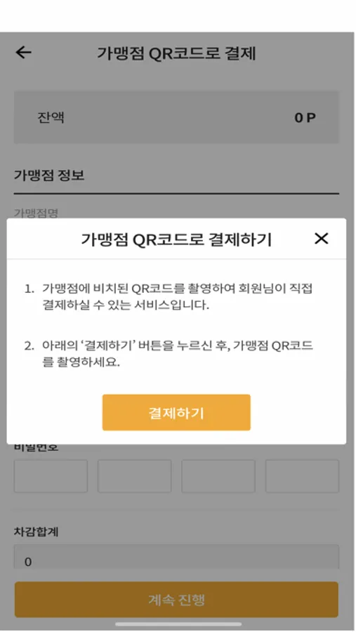 - 가맹점 QR 결제키트 스캔 (촬영) > 결제금액 입력 > 결제완료