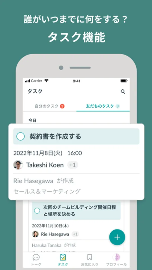 トークの参加メンバーへ「担当者・期限・内容」をまとめたタスクを簡単に共有できます。タスク一覧からみんなで進捗を確認しあうことができます。