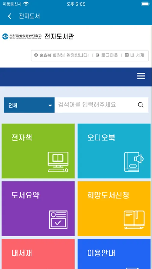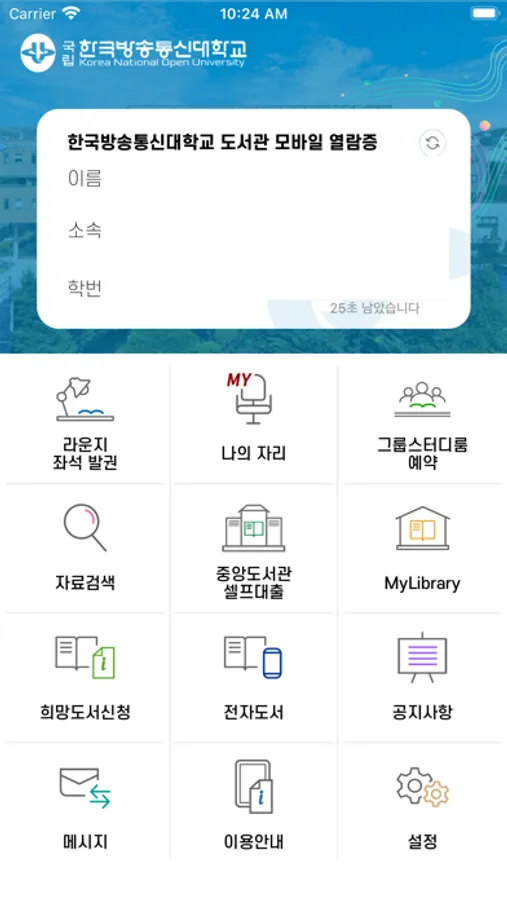 한국방송통신대학교 중앙도서관 이용자들의 이용 편의를 위하여 제작한 어플리케이션으로 아래와 같은 서비스를 제공합니다.