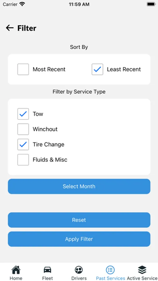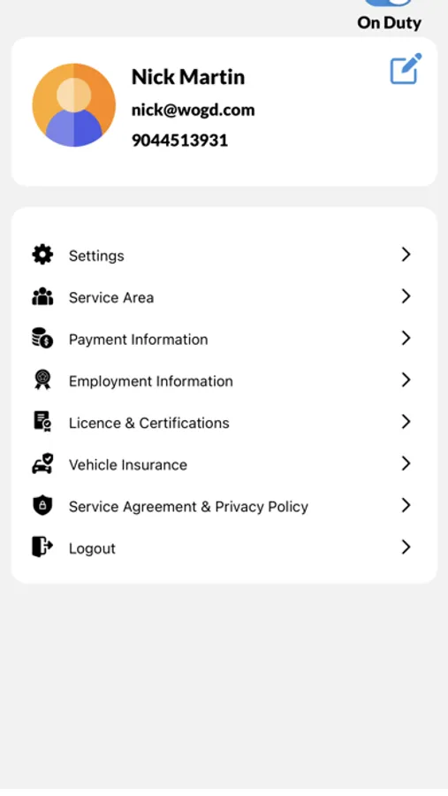 Add driver information, vehicle information, and change the service area you cover as needed. Select if you are on duty or off duty depending on if you’re ready to receive service requests or not.