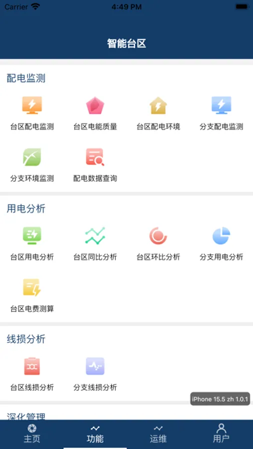 作为低压智能台区的客户端,对智能台区实时运行数据进行监控,以及精细化管理。主要功能包括配电监测、用电分析、线损分析、深化管理以及智能运维等。