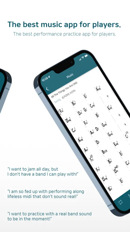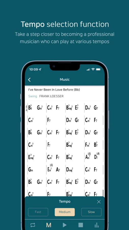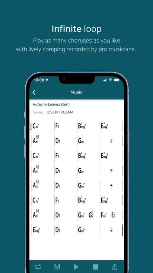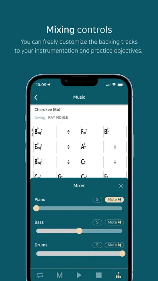 Once you download the backing tracks from the app database by saving them to your playlist, try playing along a full live band sound with piano, bass, and drums.