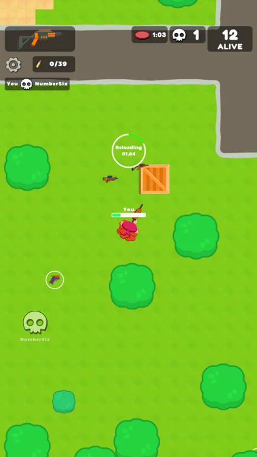 Your character will automatically shoot at nearby opponents, so you just need to focus on movement. Move near boxes to break them and stand on weapons and ammo to pick them up.