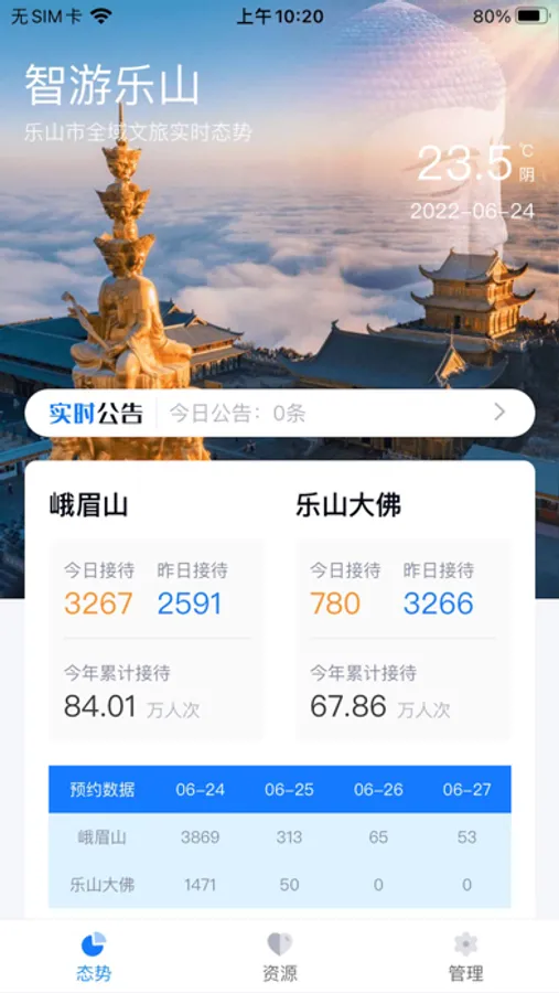 “智游乐山管理端”综合服务平台整合乐山全域层面的旅游、文化、便民服务等相关资源,基于全域文旅产业大数据,并通过全域旅游景区、文化场馆的监控信息、流量信息、销售信息、舆情信息、游客画像、环境信息,对重点文旅单位做到实时监控监测,实时呈报全域旅游状况,及时预警预报并集成应急处置等相关业务处置功能,是全域文旅运营监测及管理的智慧大脑。