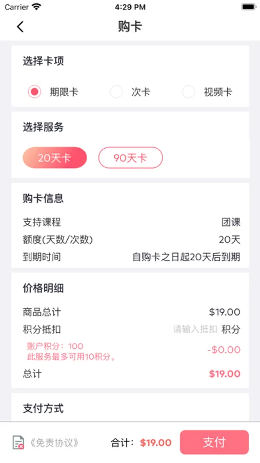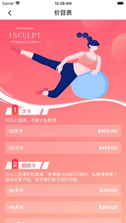 次数卡:用于在线约课,办理期限卡的会员,可预约团课,可预约私教课,不同课程的扣卡次数不同。