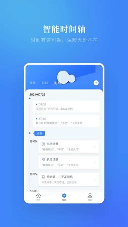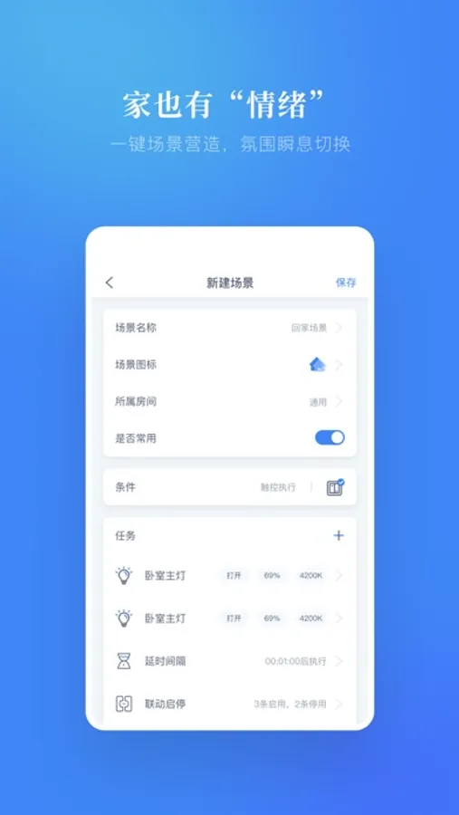 一个场景执行包含多个设备的多种状态运行,例如在您回家的时候,你可以点一下回家场景,全屋的智能设备会根据您预先设置的设备动作,执行一系列的自动设备状态切换,一步到位,一秒入境。