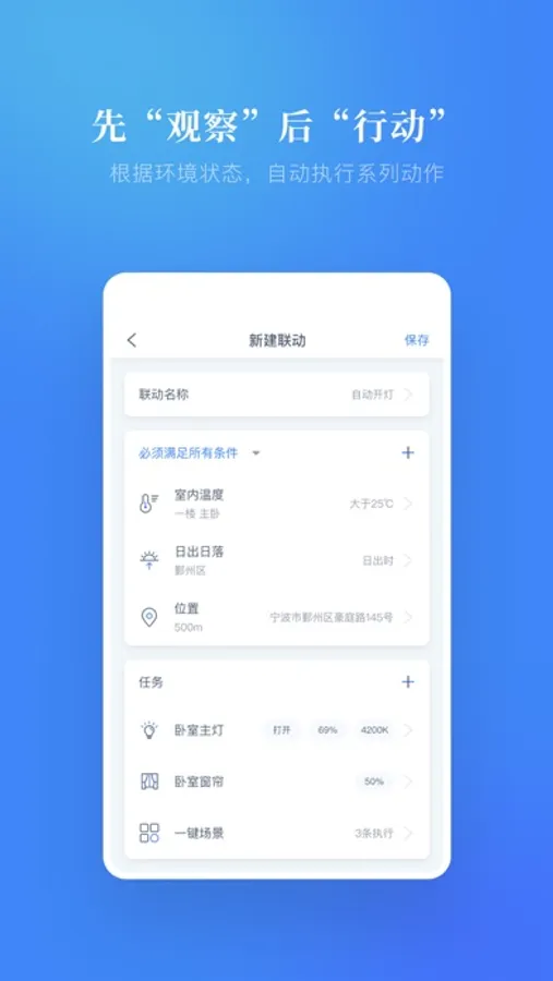 汇集感知房屋的各类传感数据,当满足某些特定条件时,按照预先设定的联动关系批量控制设备,被动唤醒,主动执行,实现例如人来灯亮、高温制冷、新风排浊等自动化的自适应智能控制,结合推送提醒,时刻保持家的舒适、洁净和安全。