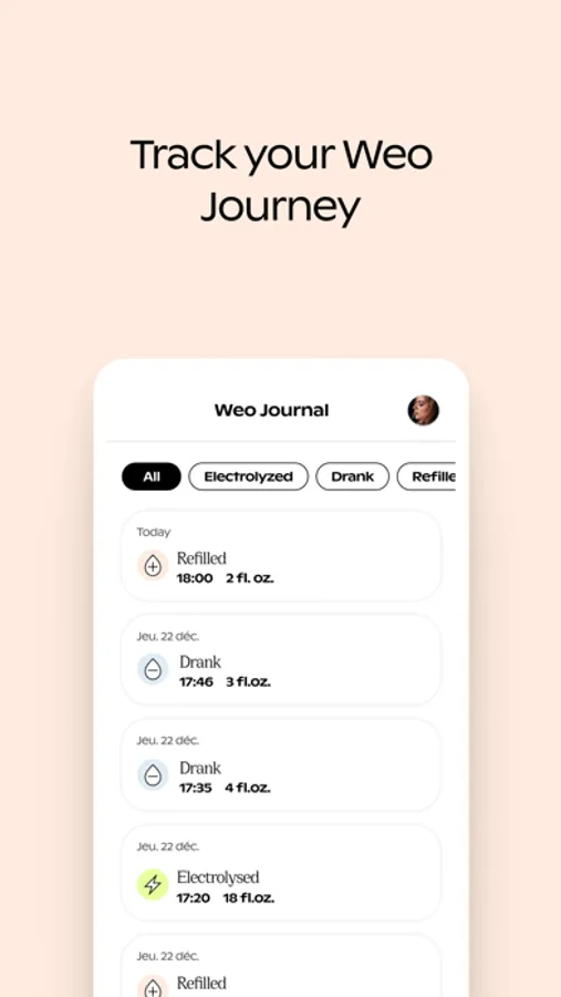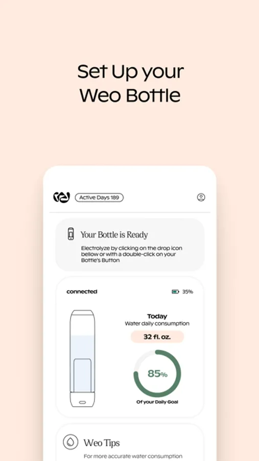 Our life-changing technology doesn't stop with The Weo Bottle. Use the App to activate your bottle, initiate its self-cleaning mode, monitor health levels, and water consumption, check your environmental impact, and stay connected to the Weo Community.