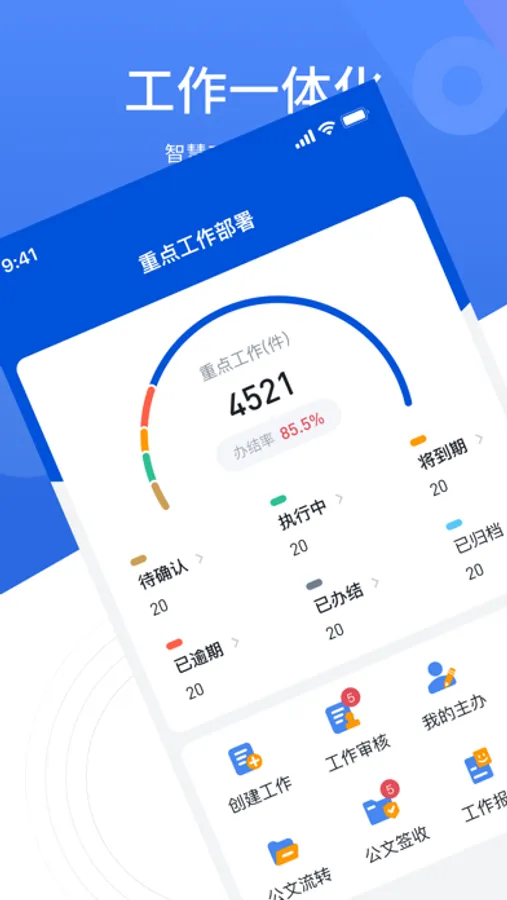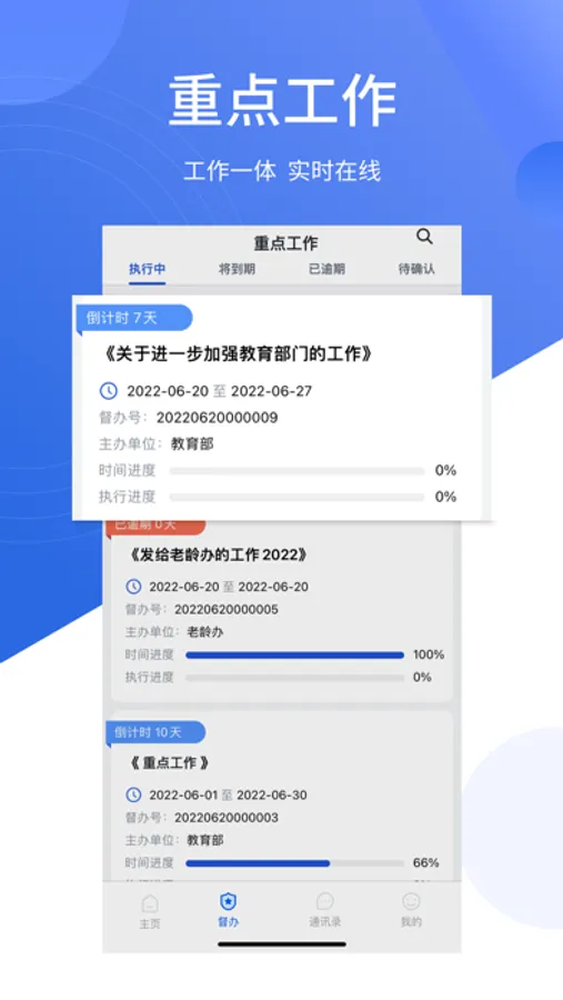 重点工作部署简化工作程序,提高工作效率,重点工程项目单位以及公司可直接通过重点工作部署系统反映其遇到的难题,加快项目推进。重点工程项目单位以及公司考核,其对重点工程项目单位以及公司的日常管理以及进展情况都会成为年底考核的依据,有利于优化项目建设环境。实现公文流转和工作任务全程动态跟踪,采用自动预警提醒,责任到单位、部门、人,数据分析统计,让数据可视化、清晰化,直观地展示工作进展情况。