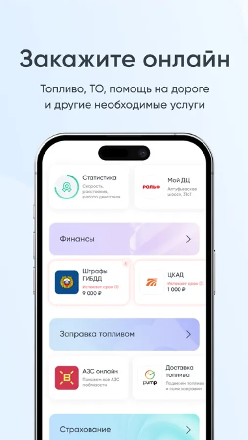 With TES.STORE, you can select all the necessary services for your car in one window of the mobile application: registration for maintenance and display of the service book, payment of fines and a map of violations, payment of the Central Ring Road, roadside assistance, calling a tow truck, mobile tire fitting, Gas station online, fuel delivery.