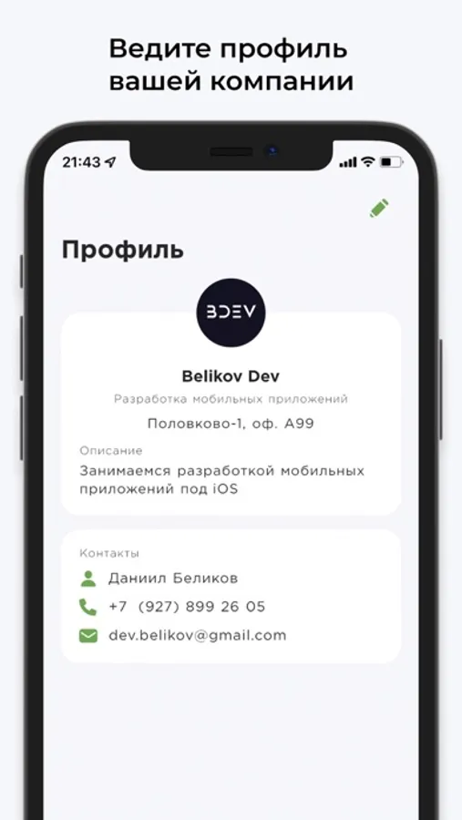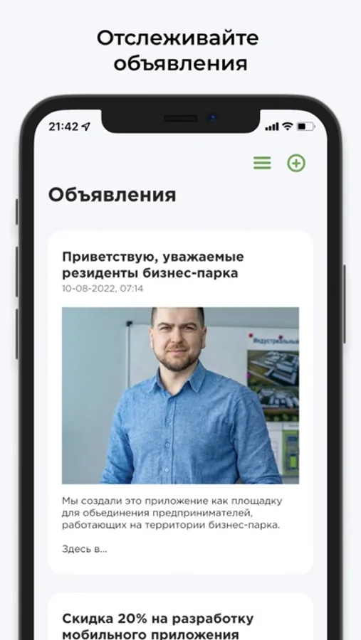 Это приложение создано как площадка для обьединения предпринимателей, работающих на территории бизнес-парка.