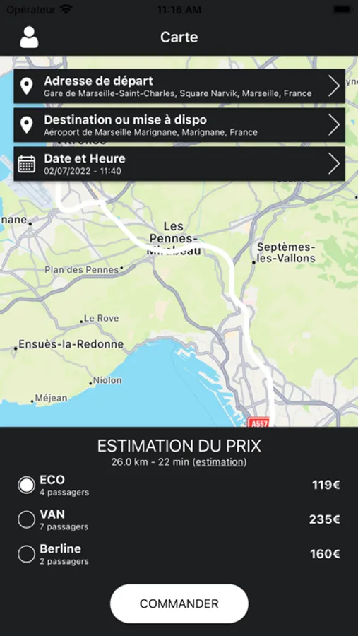 Commander facilement un chauffeur via une application simple qui vous propose plusieurs gammes de véhicule : ECO, BERLINE ou VAN.