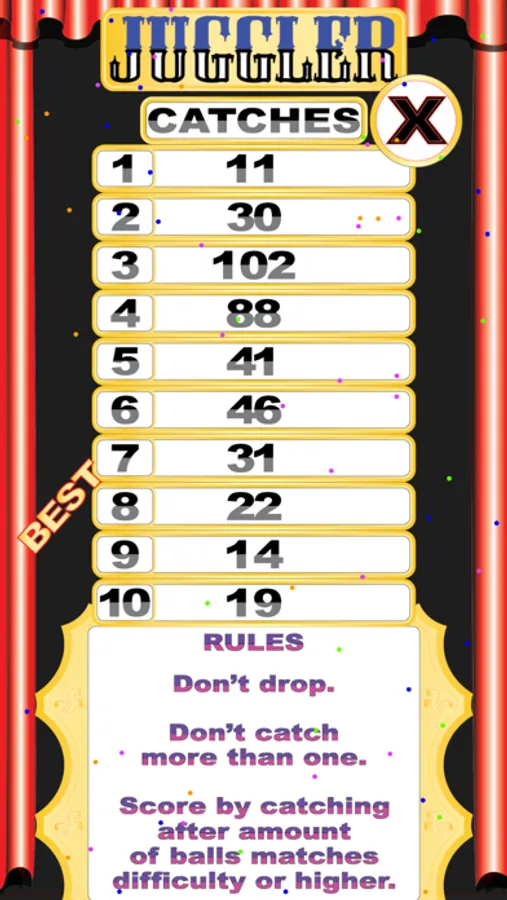 Challenge your digit dexterity with this juggling simulation GAME in where you keep as many balls moving as selected by a possible maximum difficulty of 10! Just keep swiping UP, don’t catch more than one and don't DROP! Open your steamer trunk of challenges and earn NEW PROPS with a incredible amount of CATCHES!