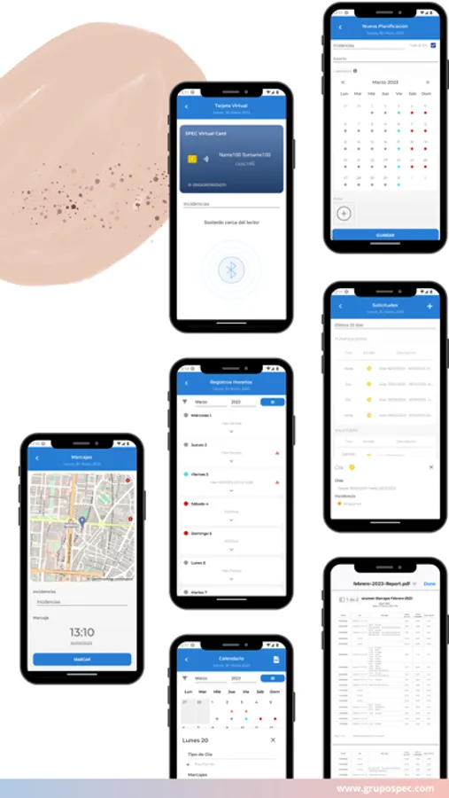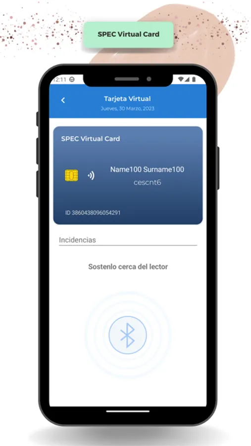 Esta aplicación incluye la tarjeta SPEC Virtual Card, que te permite fichar en un lector SPEC con Bluetooth® como si fuera una tarjeta de proximidad.
