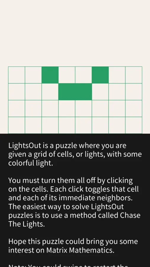 LightsOut is a puzzle where you are given a grid of cells, or lights, with some dark and others light. You must turn them all off by clicking on the cells. Each click toggles that cell and each of its immediate neighbors. All valid LightsOut puzzles can be solved without clicking on any cell twice. This is because clicking on a cell twice is the same as not clicking it at all. The easiest way to solve LightsOut puzzles is to use a method called Chase The Lights.