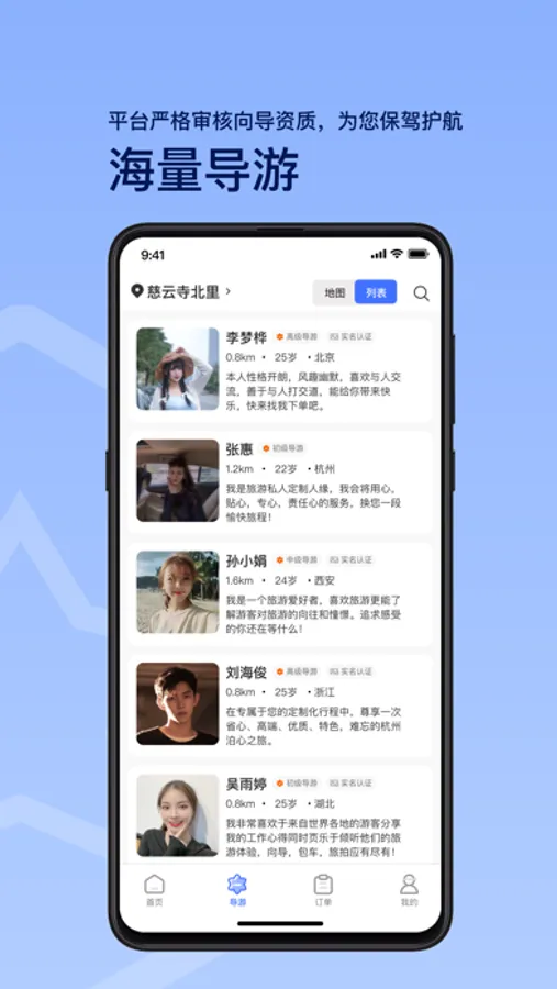 特点五:导游资料,经验、好评、个性化服务、性别、等筛选展示排名,匹配符合您线路服务需求的导游;