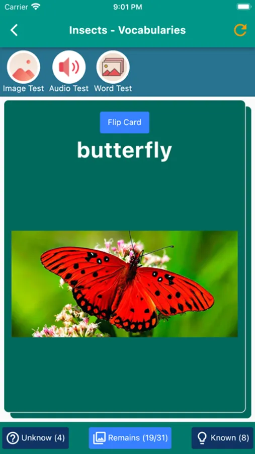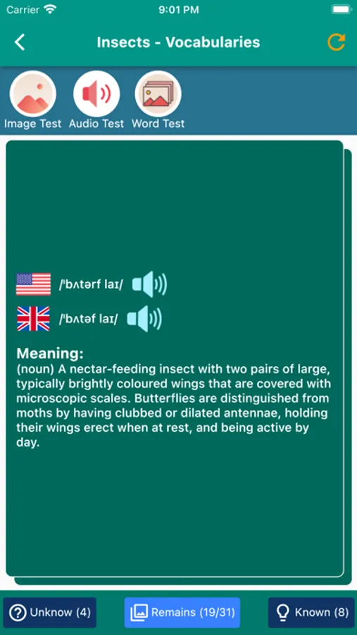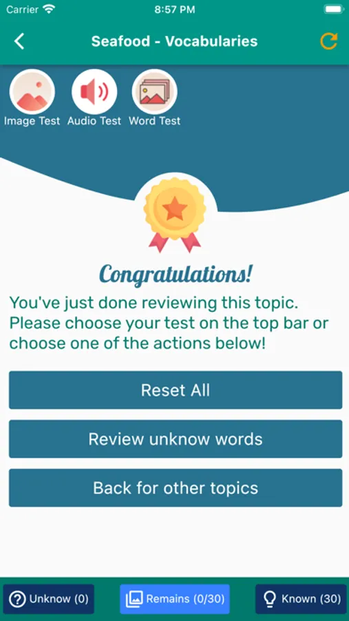 After learn, you can take tests to ensure that you remember the words and review vocabularies of each topic again if you do not remember.