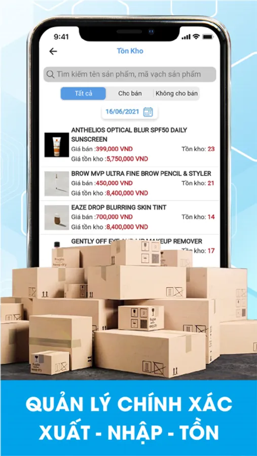 • Tồn kho hiển thị theo thời gian và chi nhánh, phân loại sản phẩm được bán và không cho bán.