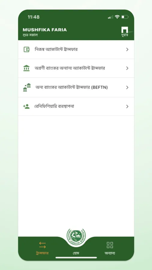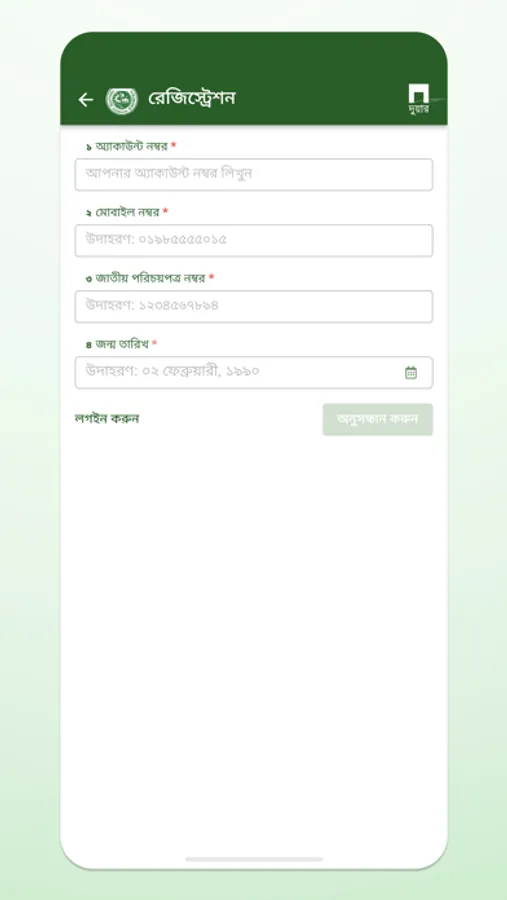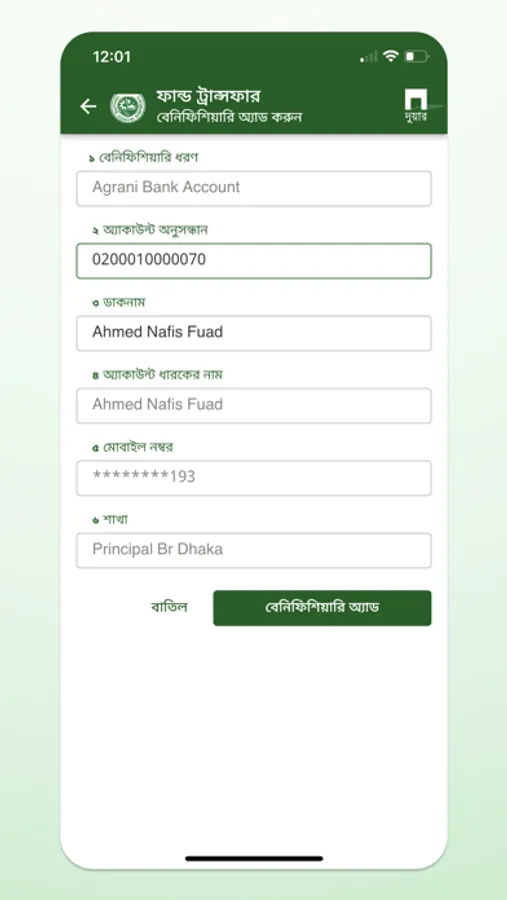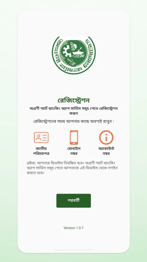 On downloading the application, during installation the customers will submit their profile and account information through the app for verification by Agrani Bank. Agrani Bank will notify the customer once the customer profile and account is verified. The customer will then visit any branch to sign the necessary documents which will result into the activation of mobile banking account for the customer
