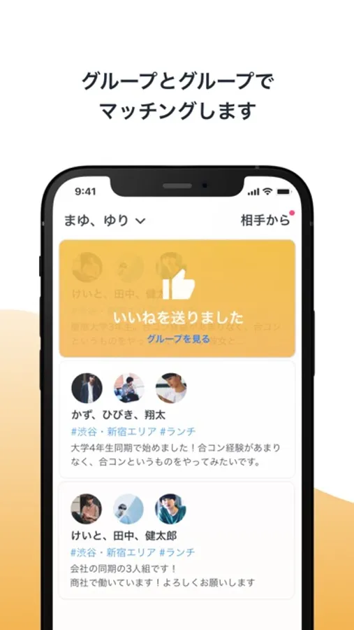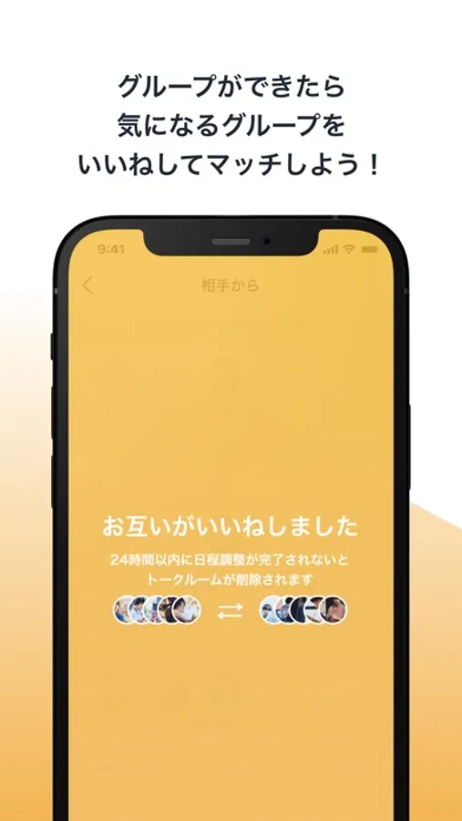 groupyはグループとグループを繋げるアプリです。仲の良い友達と一緒にグループを組み、マッチを開始します。お互いのグループがGoodするとマッチが成立し、おすすめのご飯屋さんが提案されます。そして、日程投票機能で実際に会う日時や場所を簡単に決めることができます!