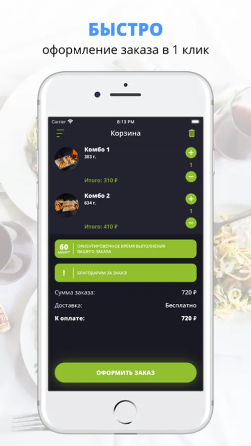 Скачивайте наше приложение, оформляйте заказ и наслаждайтесь любимой едой, где бы Вы ни были! Приятного аппетита!