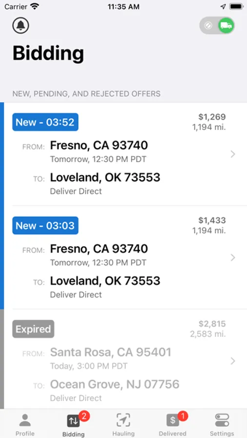After you're approved and authorized, the dispatch will send you the best loads available in your vicinity and you'll be able to make a bid, accept or reject it!