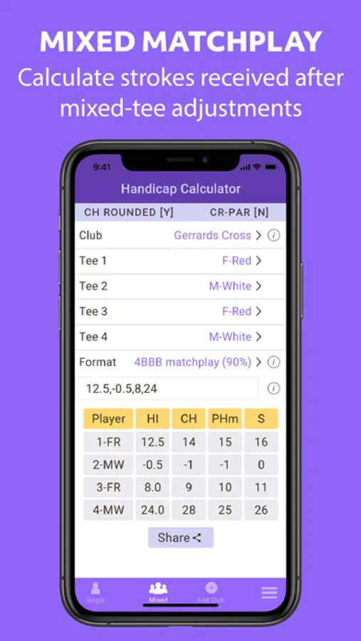 Use the Single tab if all golfers play off the same tee. Use the Mixed tab if more than one tee is used. Select the golf course, tee(s) and format of play. Enter the Handicap Indexes for the group of players. For a plus-handicap golfer enter the Handicap Index as a negative value. Share handicaps easily with playing partners or opponents prior to your match.