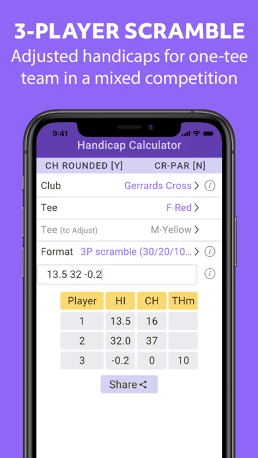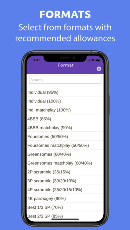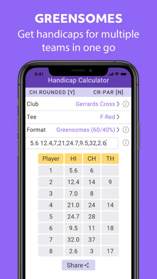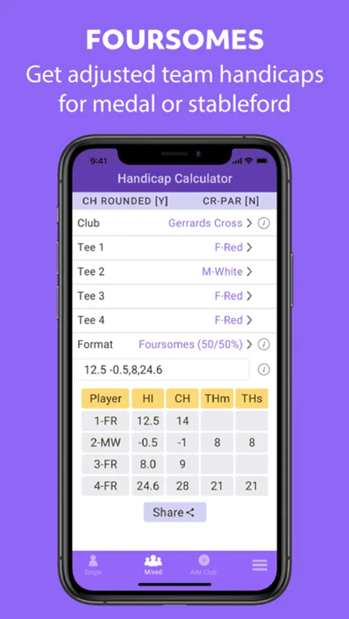 Whether you are organising friendly matches for your club or playing in team or mixed competitions, this app may be used to calculate the handicaps for all golfers including strokes received in match play. Or you may be playing in your regular four-ball and decide on the day the format and the tee(s). Just enter the relevant information in the app to get the recommended WHS Playing Handicaps for all players before you tee off.