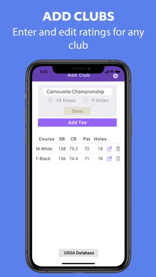 Create and manage your list of 18-hole and 9-hole courses by adding the Course Rating, Slope Rating and Par for each tee. You may also add from a custom list provided in this app and edit as necessary to maintain accuracy. The ratings may get updated from time to time so always check the data used in the app are current and accurate and update accordingly.