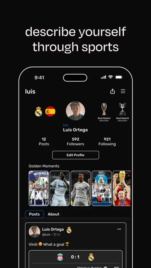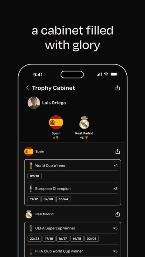 Describe yourself through the sports and teams you love, have a trophy cabinet full of trophies you won with your team and display your unforgettable moments.