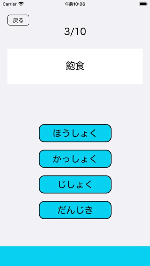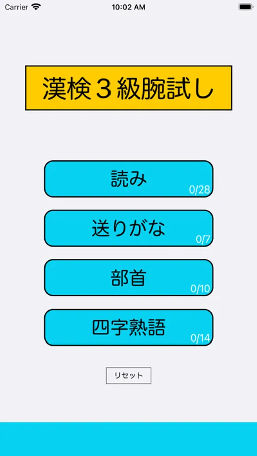 漢字検定3級配当漢字の中から、読み280問・送りがな70問・部首100問・四字熟語140問の全590問です。解答は全て選択式でサクサク進められます。