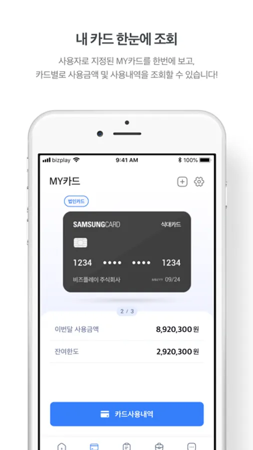• 삼성카드 비즈플레이 앱은 삼성카드 채널 bizplay 경비지출관리 서비스를 이용하는 경비 사용자에게 제공되는 앱입니다.