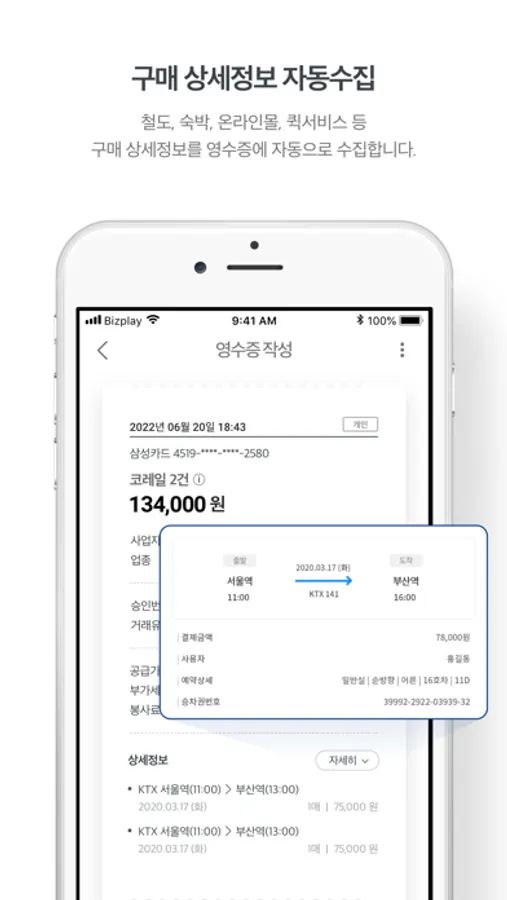 자동 수집된 법인카드 영수증과 기타간이(현금) 영수증, PC에서 수집한 개인카드 영수증, 티머니카드 영수증, 제로페이 영수증까지! 이제는 비즈플레이 모바일로 간편하게 경비처리 하세요!