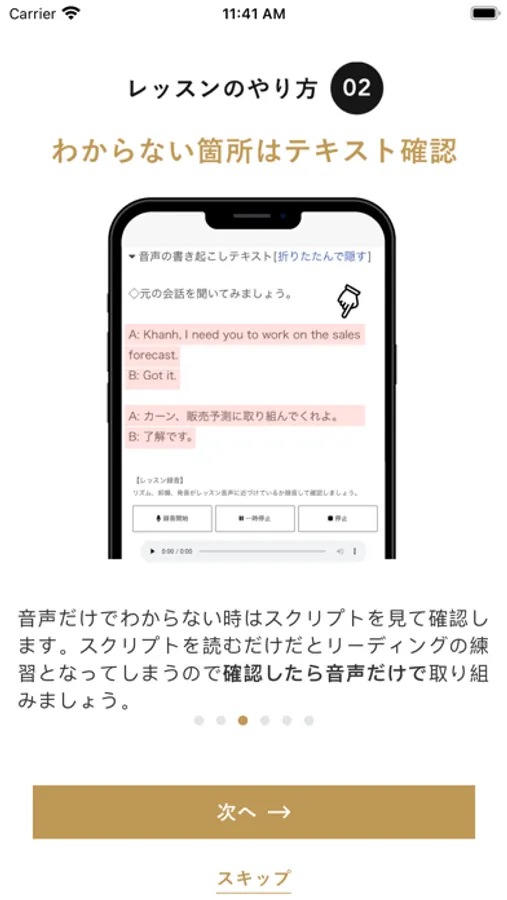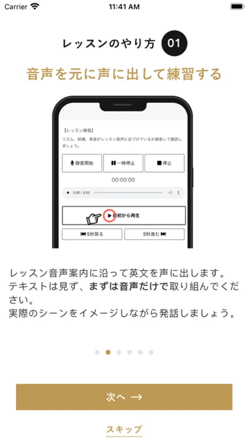 レッスン音声を聞いて、案内に沿って英文を声に出します。テキストは見ず、まずは音声だけで取り組んでください。