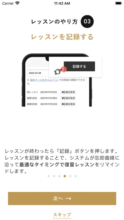 レッスンを記録することで、システムが忘却曲線に沿って最適なタイミングで復習レッスンをリマインドします。