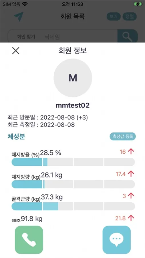 Fitrus T - 매니저는 실시간 회원과 채팅으로 소통하고 회원의 체지방율 최근 트렌드를 확인합니다.